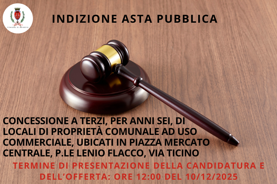 Con determina n. 1684 del 10.11.2025 il Settore Gestone del Patrimonio immobiliare ha approvato l’avviso per l’ indizione dell’asta pubblica per la concessione a terzi, per anni sei, di locali di proprietà comunale ad uso commerciale, ubicati in Piazza Mercato Centrale, Piazzale Lenio Flacco e in Via Ticino nei pressi del Cimitero Comunale.