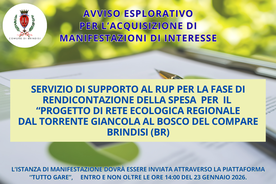 E' indetto Avviso esplorativo per l’acquisizione di manifestazioni di interesse finalizzate all’individuazione di operatori economici ai quali eventualmente affidare, tramite successivo affidamento diretto, ai sensi dell’articolo 50, comma 1, lett. b) del d.lgs. n. 36/2023 e s.m.i., mediante piattaforma “Tutto Gare” del Comune di Brindisi, il servizio di supporto al RUP per la fase di rendicontazione della spesa  per  il  “PROGETTO DI RETE ECOLOGICA REGIONALE DAL TORRENTE GIANCOLA AL BOSCO DEL COMPARE - Brindisi (BR)-  primo e secondo stralcio, Codice CUP: J85D19000010002, finanziato dal “P.O.R. Puglia FESR FSE 2014/2020. Asse VI "Tutela dell'ambiente e promozione delle risorse naturali e culturali" - Obiettivo specifico 6.f Migliorare le condizioni e gli standard di offerta e fruizione del patrimonio nelle aree di attrazione naturale – Azione 6.6” - DGR n° 176 del 16/02/2019.