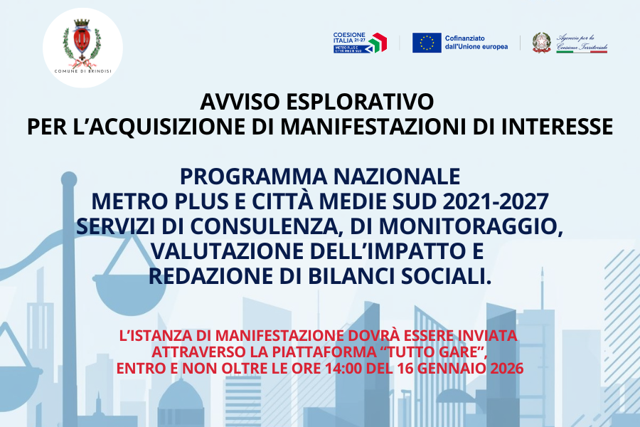 Avviso Esplorativo per l’acquisizione di manifestazioni di interesse "PROGRAMMA NAZIONALE METRO PLUS E CITTÀ MEDIE SUD 2021-2027" - Servizi di consulenza, di monitoraggio, valutazione dell’impatto e redazione di bilanci sociali.