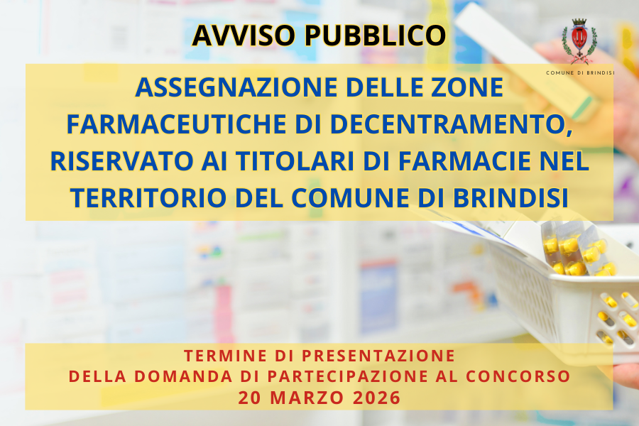 Avviso pubblico per la presentazione delle domande di ammissione al bando di concorso per l'assegnazione delle zone farmaceutiche di decentramento, riservato ai titolari di farmacie nel territorio del Comune di Brindisi.