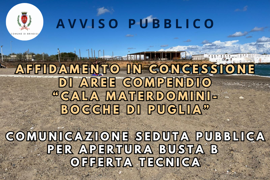 Con riferimento all’avviso pubblico per la concessione delle aree facenti parte del Compendio “Cala Materdomini - Bocche di Puglia”, si comunica che l’apertura della busta B relativa all’offerta tecnica è fissata, in seduta pubblica, in data 08/04/2026 alle ore 10:00 presso il Settore Servizi Finanziari, Tributi e Risorse Strumentali del Comune di Brindisi.