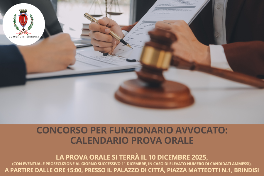 che la prova orale del concorso in oggetto si terrà il 10 dicembre 2025, (con eventuale prosecuzione al giorno successivo 11 dicembre, in caso di elevato numero di candidati ammessi)a partire dalle ore 15:00, presso il Palazzo di Città, Piazza Matteotti n.1, Brindisi.