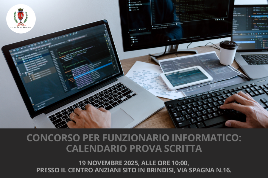 che la prova scritta del concorso in oggetto si terrà il 19 novembre 2025, alle ore 10:00, presso il Centro Anziani sito in Brindisi, via Spagna n.16.