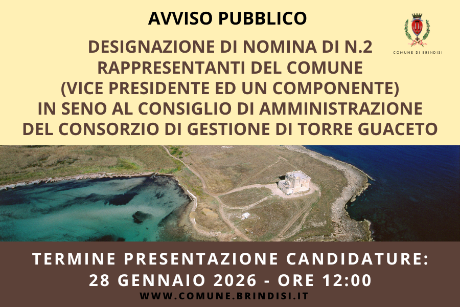 Scade alle ore 12:00 di mercoledì 28 gennaio 2026 il termine di presentazione della proposta o dichiarazione di disponibilità alla designazione per la nomina di due rappresentanti del Comune di Brindisi in seno al Consiglio di amministrazione del Consorzio di gestione di Torre Guaceto, uno dei quali con ruolo di Vice Presidente e l’altro come componente.