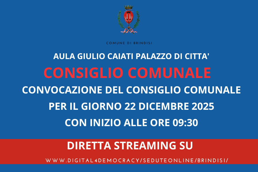 E' convocato il Consiglio Comunale per lunedì 22 dicembre 2025 con inizio alle ore 09:30 ed eventualmente in seconda convocazione per lunedì 29 dicembre 2025 alle ore 09:30.
