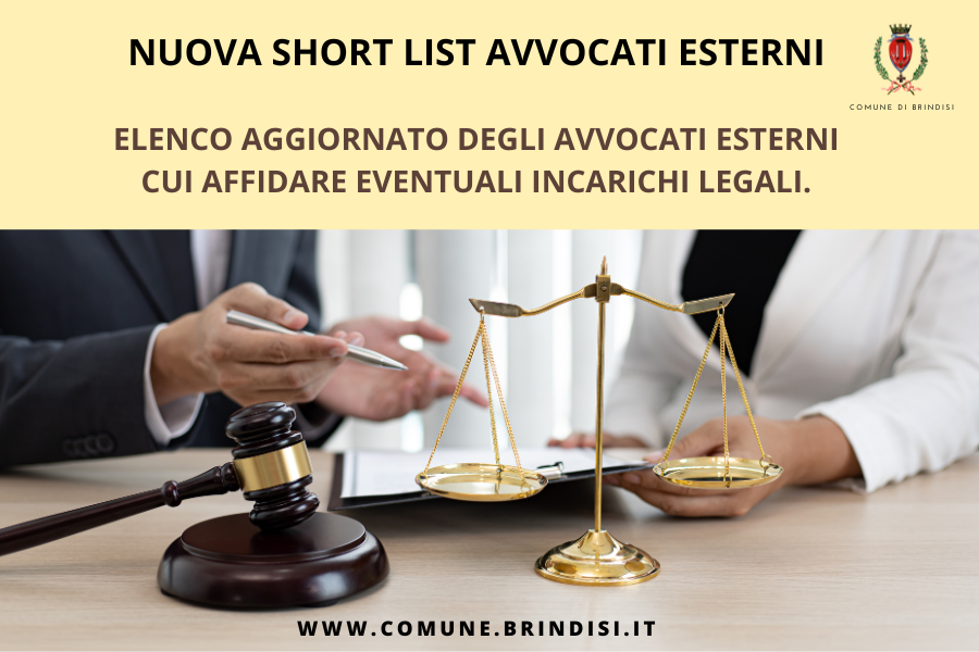 Si rende noto che, con determinazione della Civica Avvocatura N. d'ordine Reg. Gen. 1805 del 28/11/2025, pubblicata all'albo pretorio dell'Ente in data 28/11/2025, il Comune di Brindisi ha approvato il nuovo elenco aggiornato di avvocati cui affidare eventuali incarichi di patrocinio legale e/o di domiciliazione e/o di sostituzione processuale.