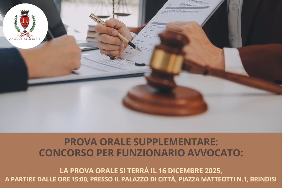 Si rende noto che la prova orale supplementare del concorso pubblico, per esami, per la copertura di n.1 posto di Funzionario AVVOCATO, si terrà il 16 dicembre 2025, alle ore 15:00, presso il Palazzo di Città, Piazza Matteotti n.1, Brindisi, 1° piano.